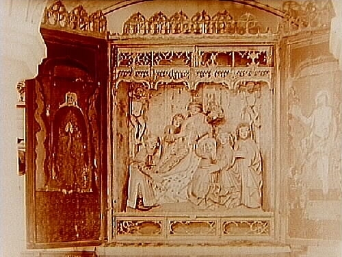 Altarskåp med två luckor, svenskt arbete, 1500-talet, från Rinkaby kyrka.