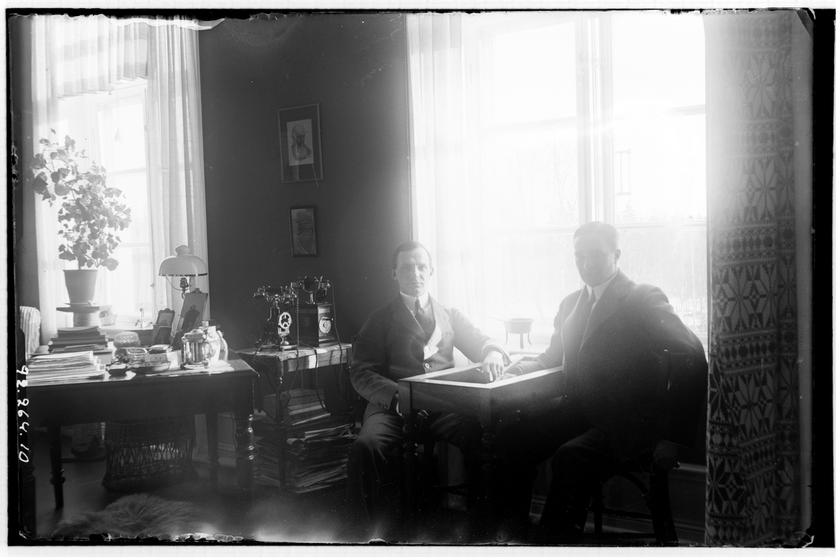 Hålahults sanatorium, interiör, två män sittande, två telefoner på ett bord