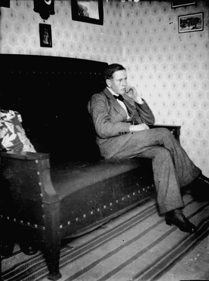 Titel: Rumsinteriör, sittande man.