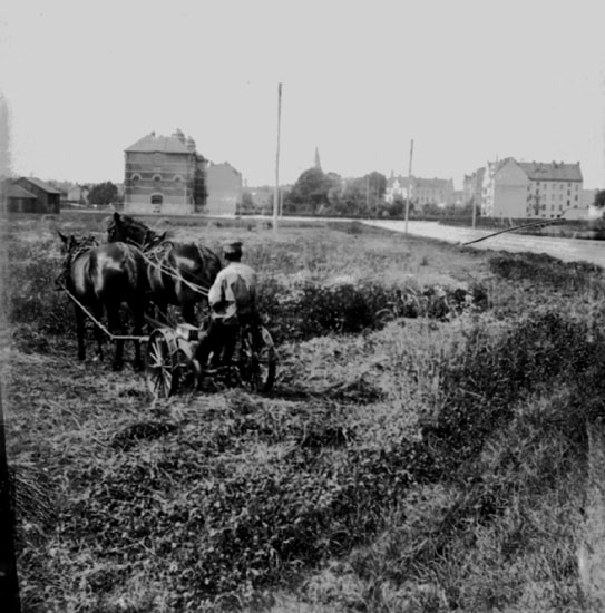 Risbergska skolan till vänster och bostadshus till höger. Nikolaikyrktorn skymtar i bakgrunden. Plogning i åkrar på öster.