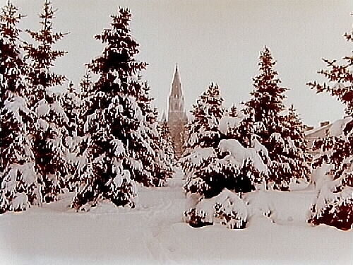 Olaus Petrikyrkan och Sofiaparken med snötyngda granar.