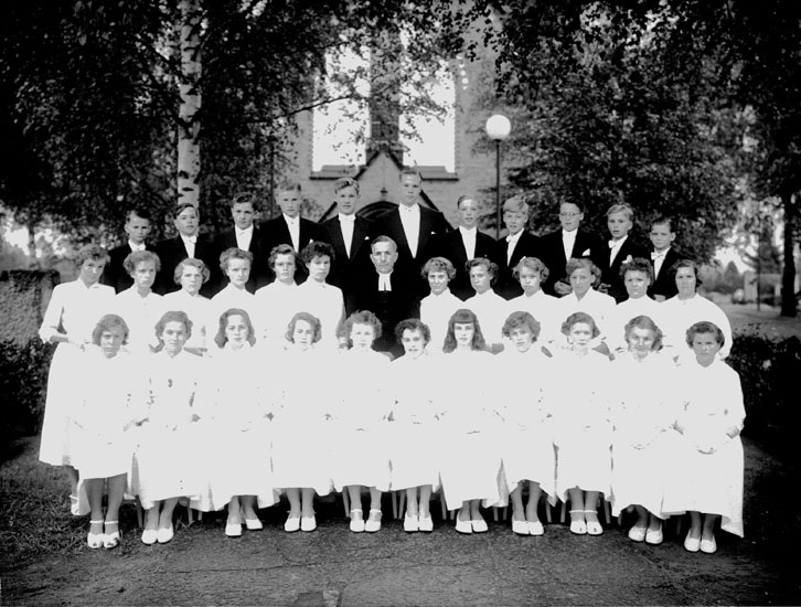 Konfirmander, 23 flickor, 11 pojkar och kyrkoherde Berndt Bäcklund.