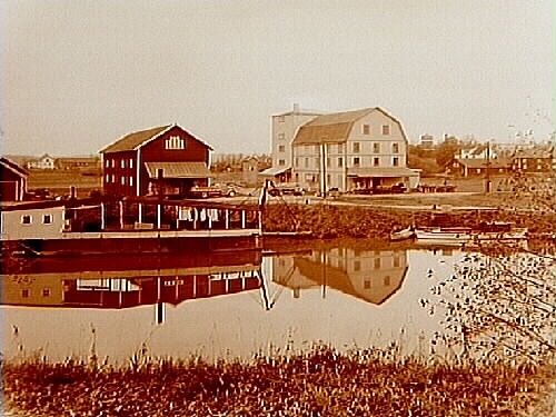 Odensbackens Kvarn AB, Nya Kvarnen vid Kvismare kanal, trevånings kvarnbyggnad, två lastbilar och två hästskjutsar vid kvarnen.
