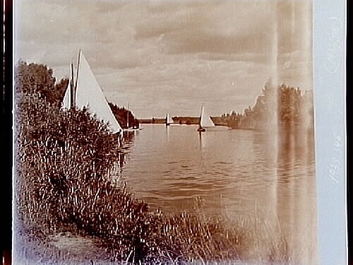Svartåns mynning i Hjälmaren, fyra segelbåtar.