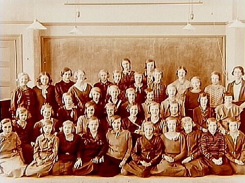 Engelbrektsskolan, klassrumsinteriör, 35 skolflickor med lärarinna fröken Gerda Andersson, sal 24.