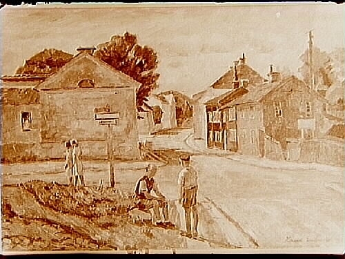 Oljemålning. Motiv: Kyrkogårdsgatan i Örebro, av konstnären Harald Eriksson.