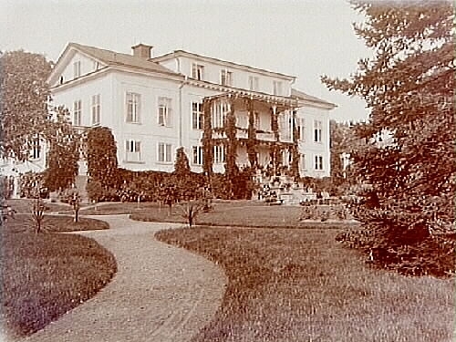 Latorps herrgård, tvåvånings herrgårdsbyggnad med frontespis, balkong och veranda, från trädgårdssidan.