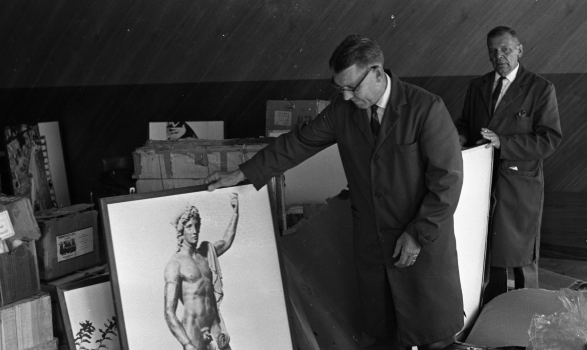 Två herrar i mörka arbetsrockar med vita skjortor inunder samt mörka slipsar flyttar tavlor. En herre bär glasögon. Herren längst fram håller i en tavla föreställande en grekisk gud. I bakgrunden syns fler tavlor samt kartonger.