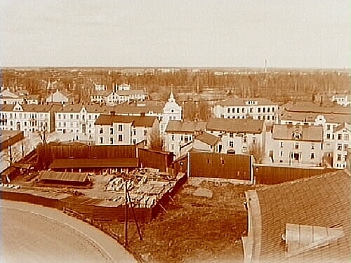 Utsikt norrut från Oskarsplan, Engelbrektsskolans klocktorn.