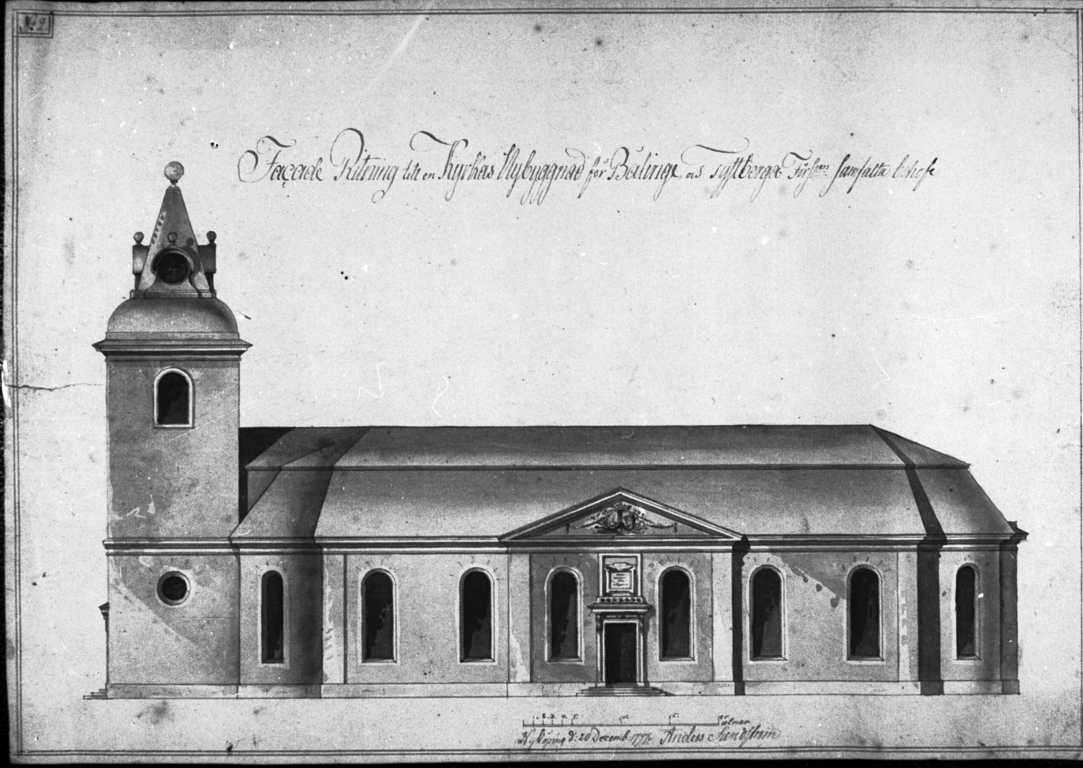 Foto av ritning av kyrkan. Facade Ritning till Reparation och Utvidgande å Bälinge kyrka 1797.
