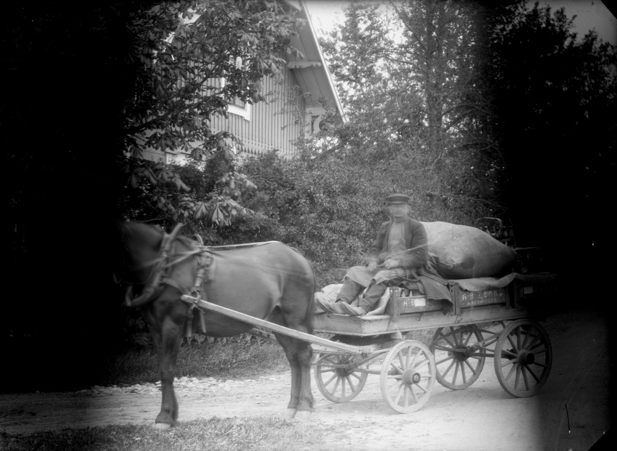 Häst spänd för vagn, en man. AB Zenks Ångbryggeri.