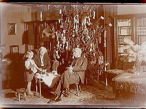 Rumsinteriör med julgran, familjegrupp 3 personer.