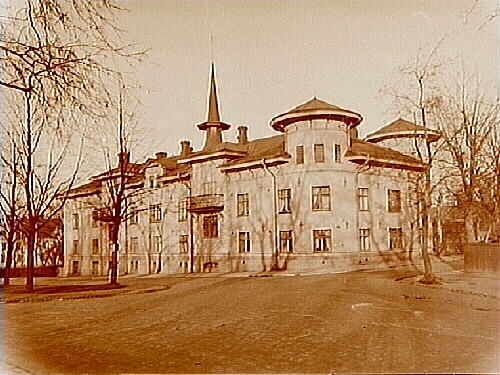 Tvåvånings bostadshus med tre frontespisar, två hörntorn på tre våningar.