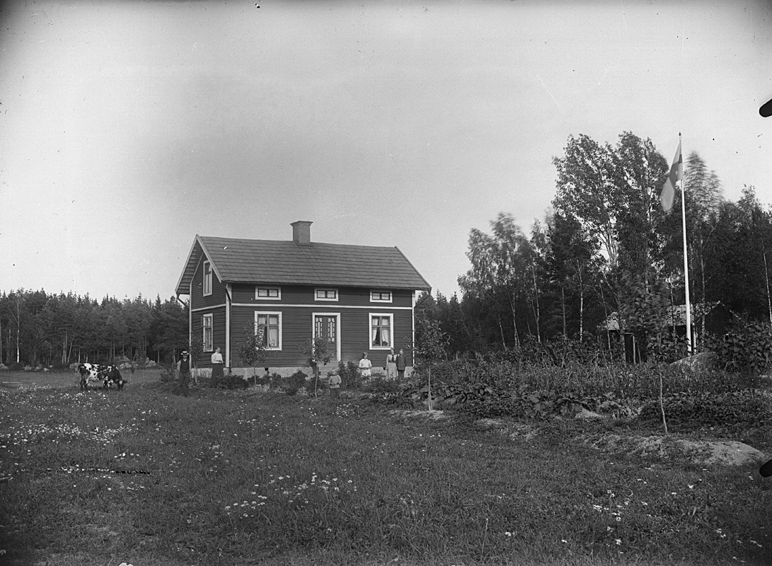 Bostadshus, familjegrupp sex personer framför huset. En ko.