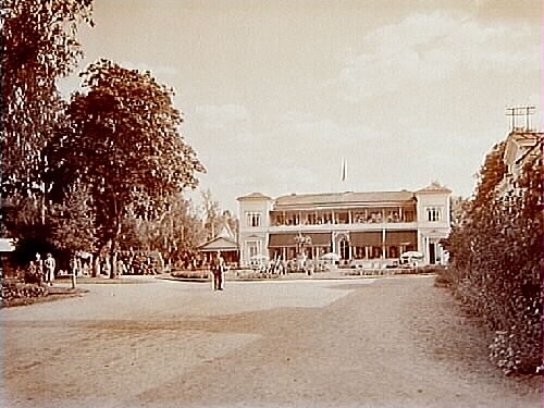Porla Brunn, tåvånings restaurangsbyggnad med balkong och veranda.