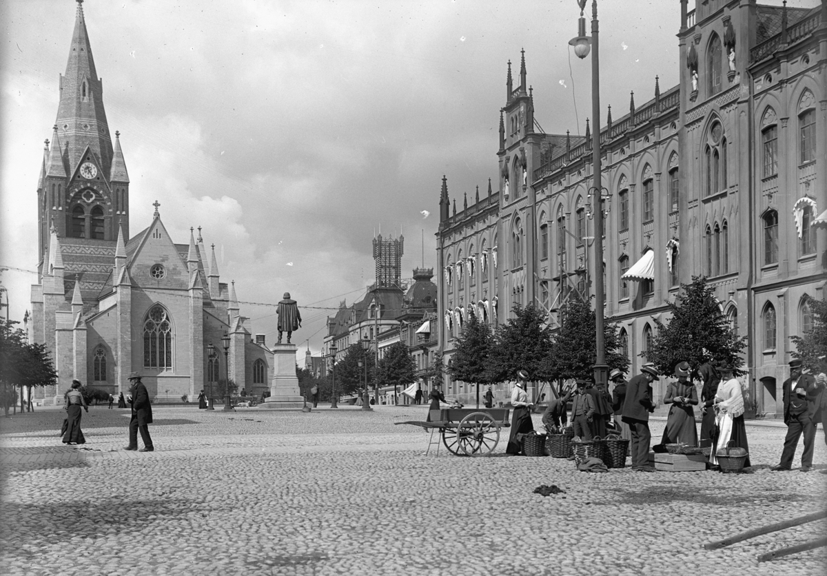 Stortorget med Engelbrektsstatyn, Rådhuset, Nikolaikyrkan.