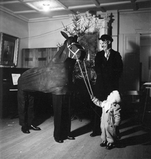 Underhållning, tre män (två av dem utklädda till häst) och en liten pojke.