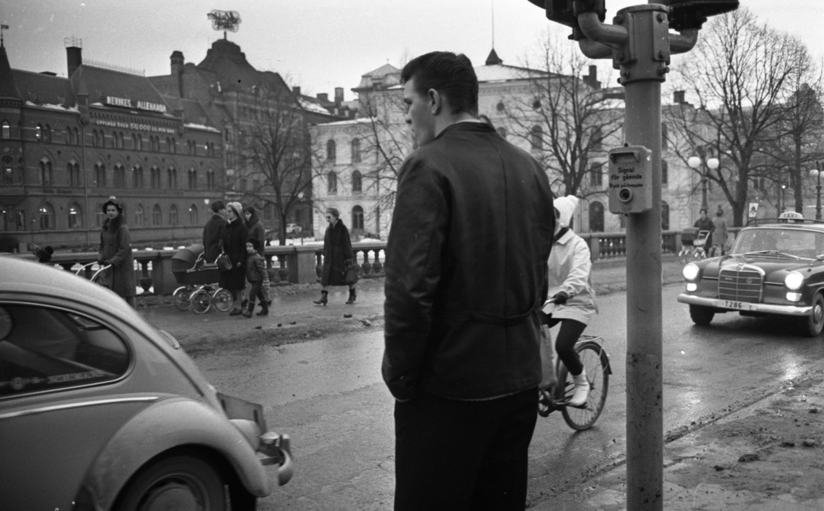 På Storbron står en man vid trafikljuset. På bilden ser man en kvinna cykla, och två bilar. Man ser också Gamla teatern och Nerikes Allehanda.