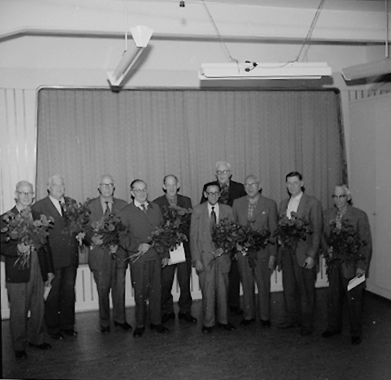 Rumsinteriör, grupp 10 män, Oscarias pensionärer. Avtackning.