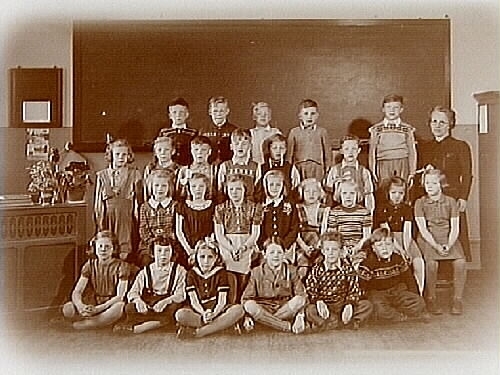 Vasaskolan, klassrumsinteriör, 25 skolbarn med lärarinna fröken Märta Ljungdahl, sal 1, klass 2.