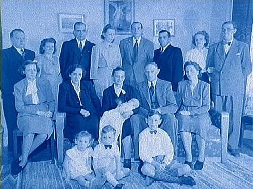 Rumsinteriör, släktgrupp tretton vuxna och fyra barn.