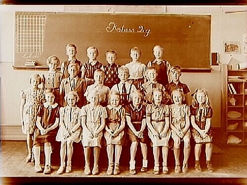 Vasaskolan, klassrumsinteriör, 20 skolbarn med lärarinna fröken Ella Jansson, klass 2g, sal 7.