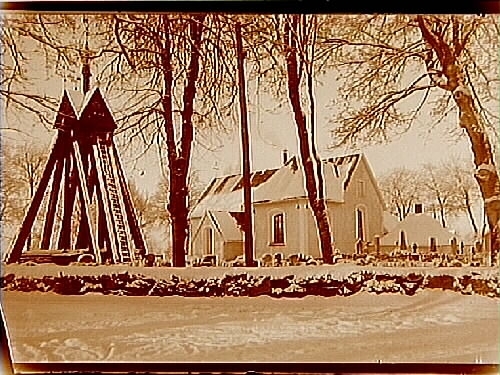 Titel: Almby kyrka och klockstapeln. Vintermotiv. Beställningsnr: AY-142.