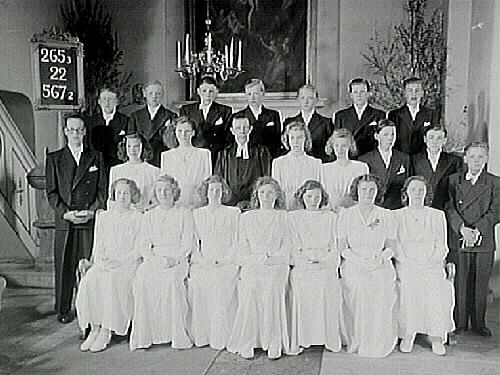 Konfirmander, 11 flickor, 11 pojkar och kyrkoherde Gabriel Carlsten, Ekeby.