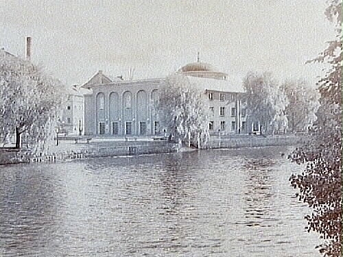 Konserthuset, stenhus i tre våningar med klassicerande fasad i grå grovputs.