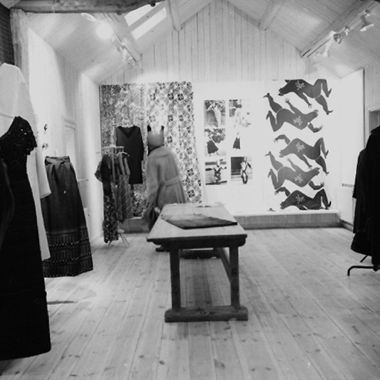 Klädutställning i Wadköping, interiör av utställningssalen, en kvinna.