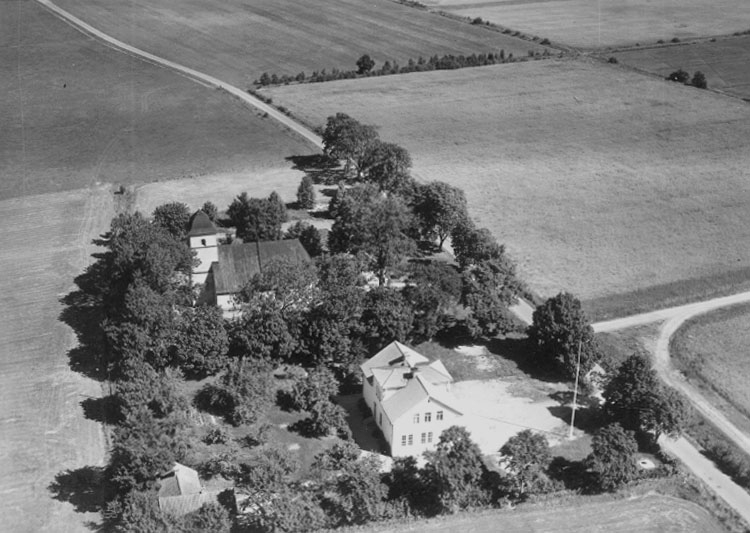 Flygfoto över Gräve, kyrkan och bostadshus.