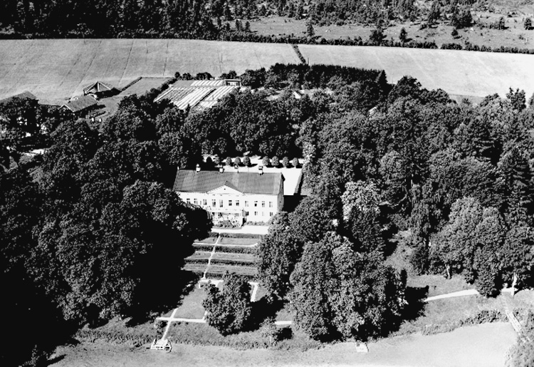 Flygfoto över Trystorps Herrgård, tvåvånings herrgårdsbyggnad.