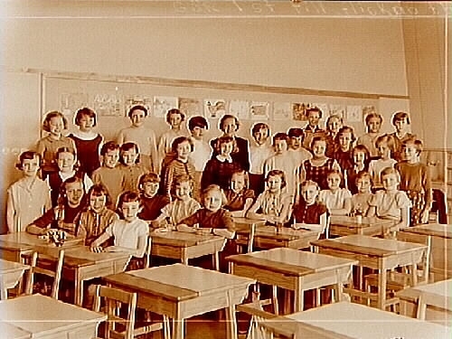 Vasaskolan, klassrumsinteriör, 35 flickor med lärarinna fru Barbro Ahlecrantz, klass 4d, sal 20.