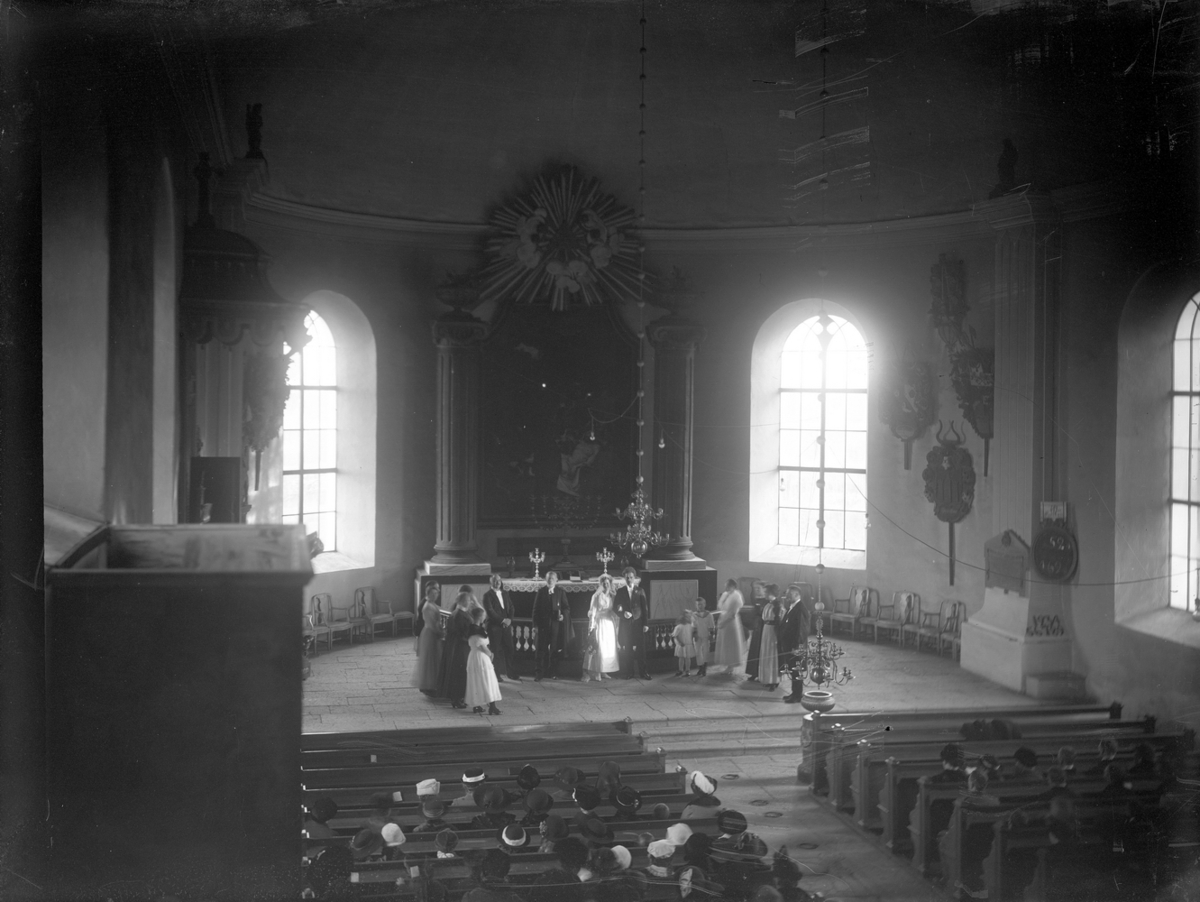 Kyrkointeriör, bröllop, brudpar, bröllopsgäster och en präst.
