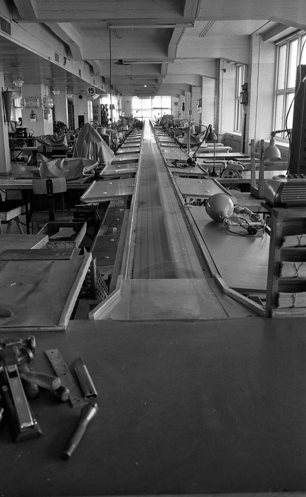Närbild på en stämpelklocka i skofabriken samt en tidning som hänger på anslagstavlan: Platsjournalen.