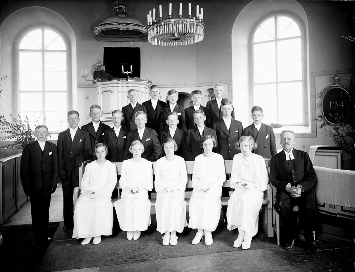 Konfirmander, 5 flickor, 14 pojkar och kyrkoherde Morén.