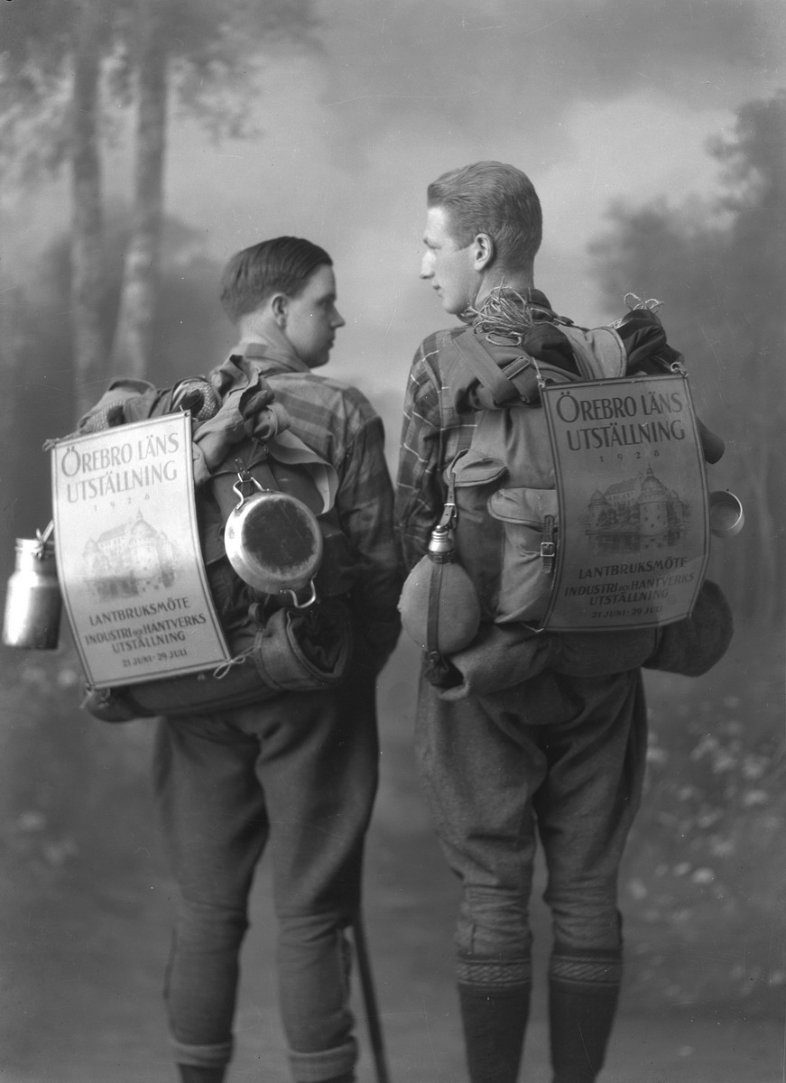 Två unga män med affischer på ryggen: "Örebro läns utställning 1928. Lantbruksmöte, Industri och hanverksutställning 21 juni - 29 juli".