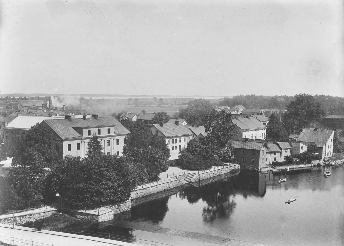 Karolinska skolan till vänster, från Slottet mot öster. Byggnader utefter Olaigatan och Svartån.