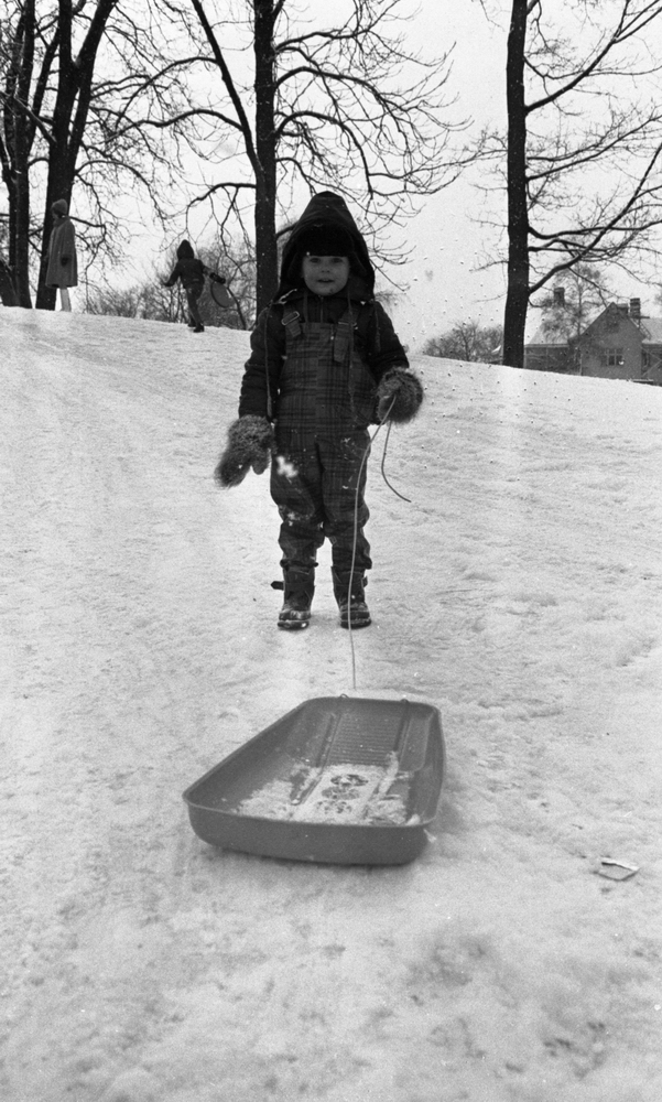 En pojke står i pulkabacken och håller i sin pulka. Han har rutiga galonbyxor och en jacka med luva. Högst upp i backen står en kvinna med kappa och vita stövlar.