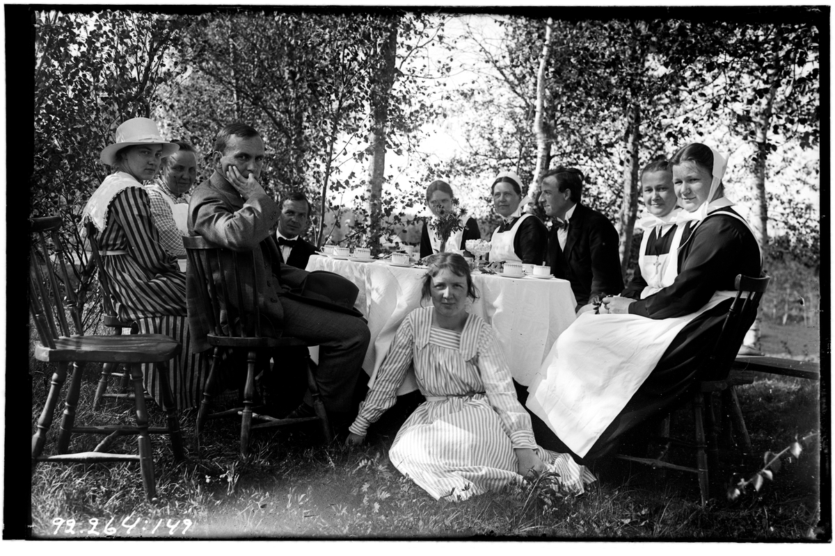Hålahult sanatorium, exteriör, tre män, sju kvinnor runt ett kaffebord i naturen, en del med uniform, från vänster, Betty Waller dr. Wallers dotter, Hanna Johansson köksföreståndarinna
