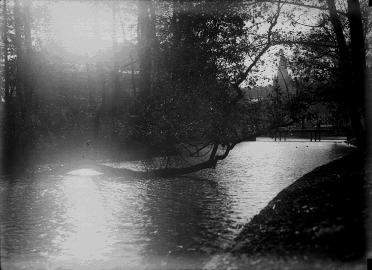 Stadsvy, parti från Slottsparken med svanar och änder.