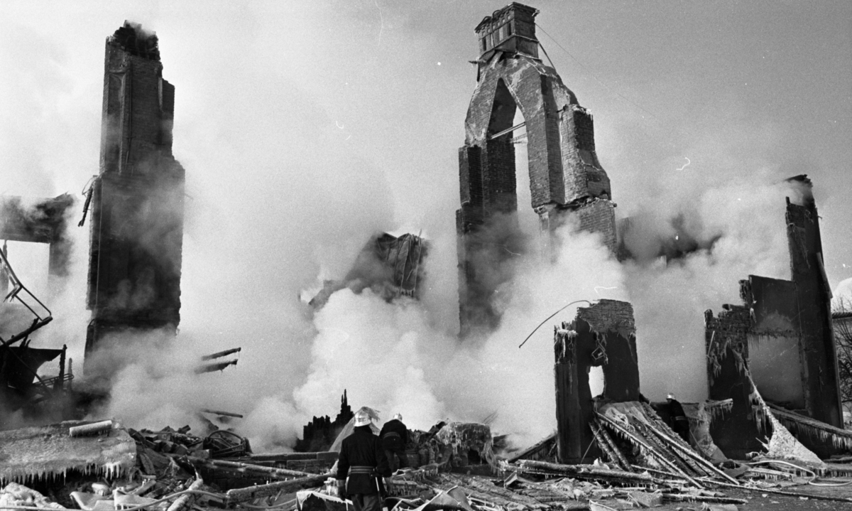 Tre brandmän går igenom ruinen efter branden i en skola i Nora. Det är stor rökutveckling på bilden.
