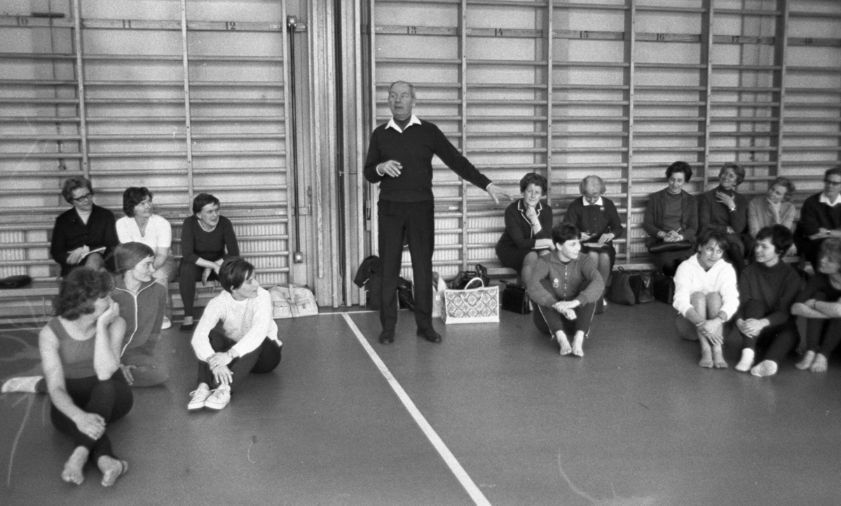 Mitt i bilden står idrottsledare Ernst Idla och instruerar åhörare och pekar med vänstra handen. Han är klädd i mörk tröja med vit krage, mörka byxor samt har en scarf i halsen. På ömse sidor om honom sitter flera gymnaster i en ring på golvet och lyssnar. På två långbänkar i bakgrunden sitter åhörare. Väskor står i mitten på golvet. På väggarna hänger ribbstolar.