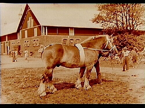 Titel: Hästpremiering vid Edsbergs Sanna, Edsbergs socken. Länets hingst Etard. Ägare: Sven Bergman, Brånsta gård, Kumla socken. Ekonomibyggnad i bakgrunden.