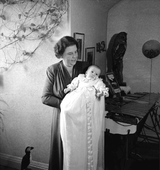 Titel: Rumsinteriör, en kvinna och en baby, barndop. Fru Falk