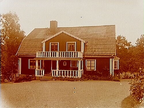 Boo Ålderdomshem, envånings bostadshus med inredd vind, brutet tak, burspråk, frontespis, balkong och veranda.