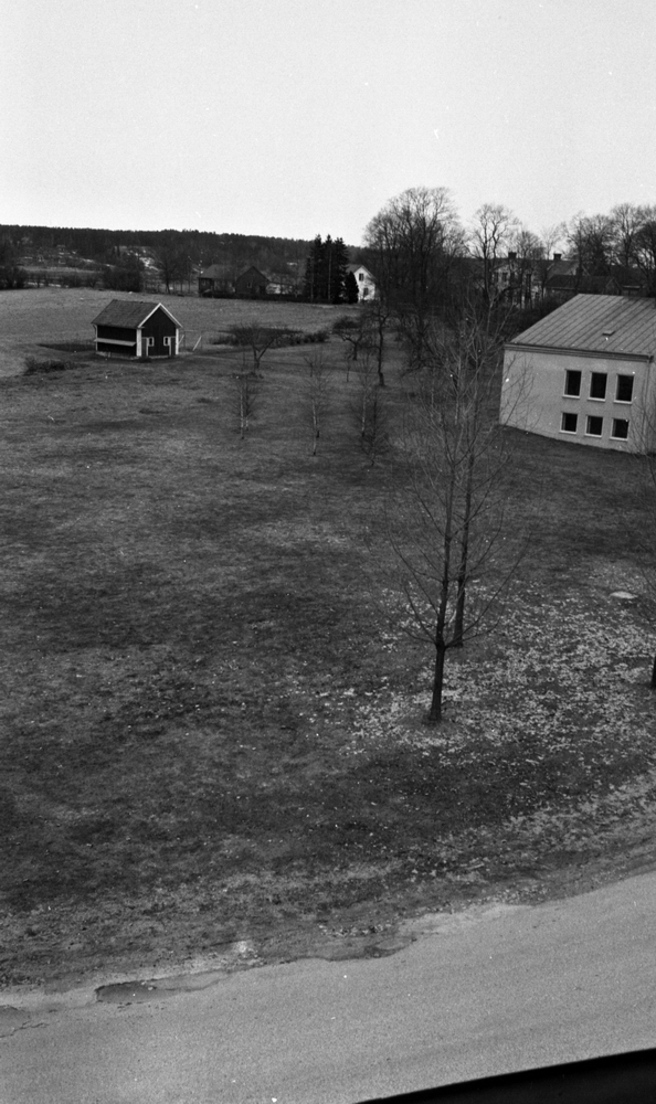 Tomt för nytt radiohus, på bilden syns Almby församlingshem till höger.