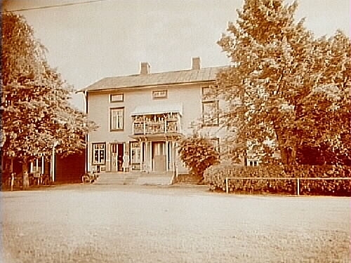 Två och en halvvånings bostadshus med förstubro och balkong.