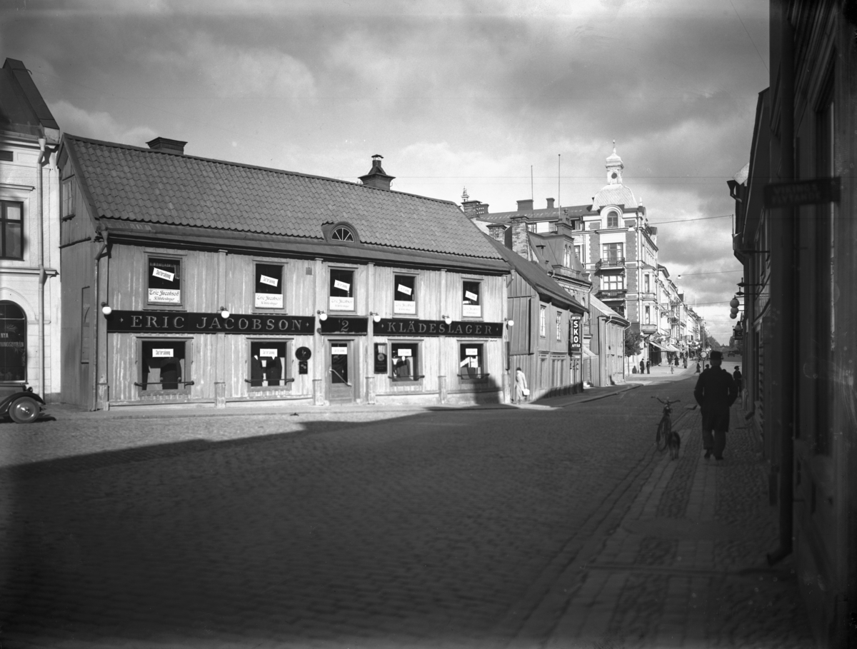 Tvåvånings bostadshus i trä med affärslokaler i gatuplanet.