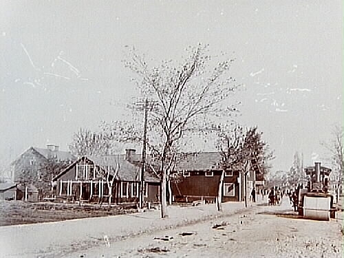Engelbrektsgatan mot norr, två och en halvvånings bostadshus, ångvält och två hästskjutsar.